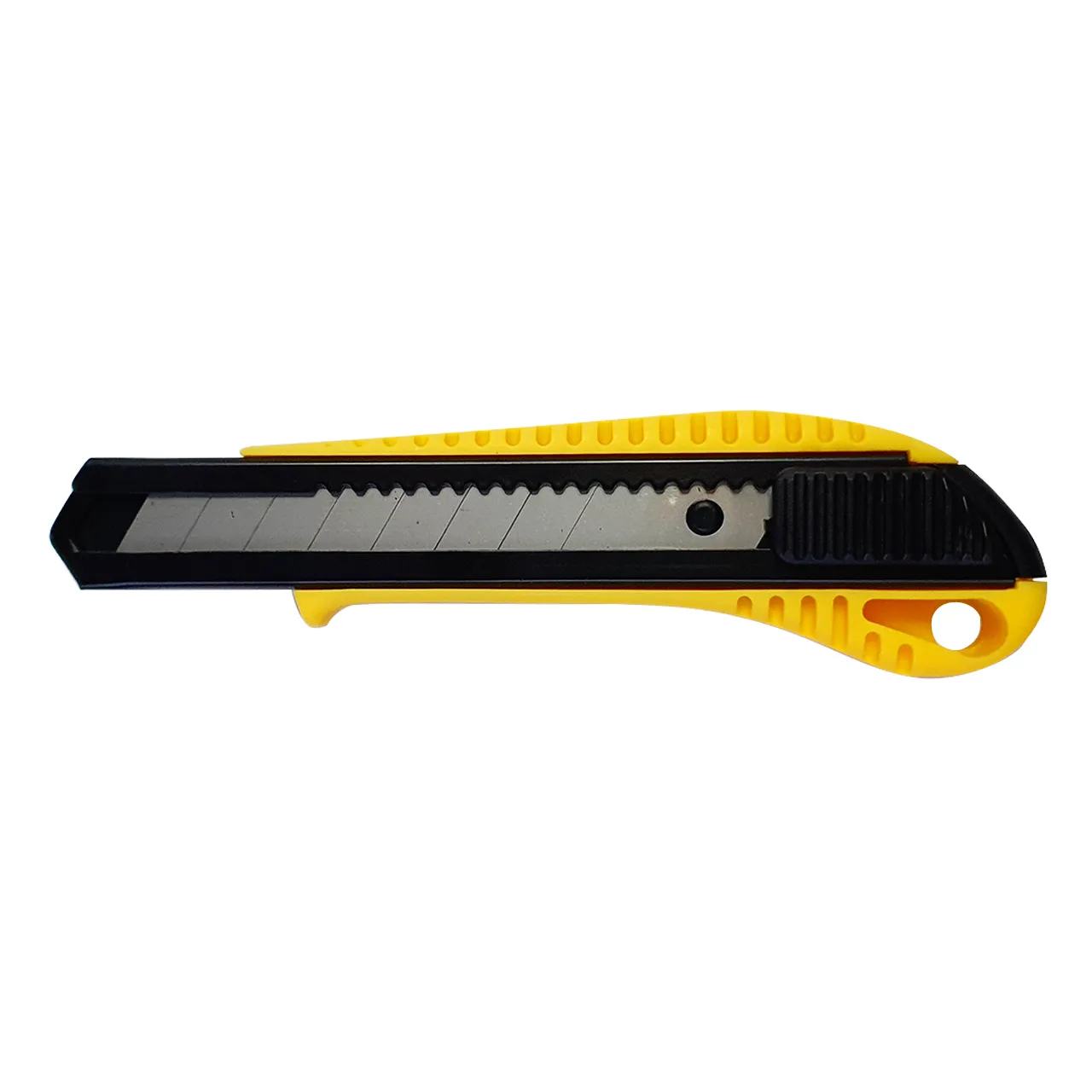 Строительный нож усиленный 18 мм оборудован фиксатором и металлическими направляющими. Канцелярский нож 15 см предназначен для резки бумаги, картона, ткани и пластика. Ребристый пластиковый корпус желтого цвета имеет специальный упор, предотвращающий скольжение пальцев. Отламывающиеся сегментированные стальные лезвия не боятся коррозии и имеют качественную заводскую заточку.